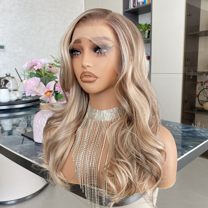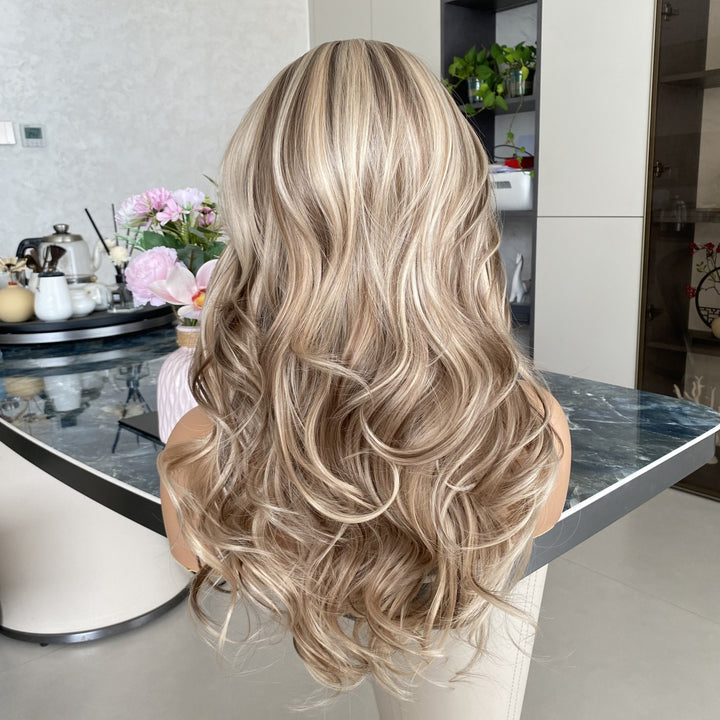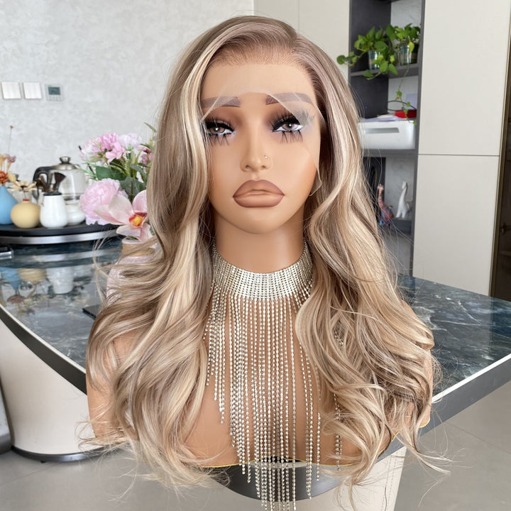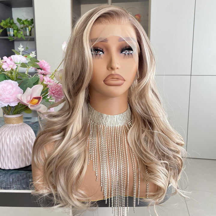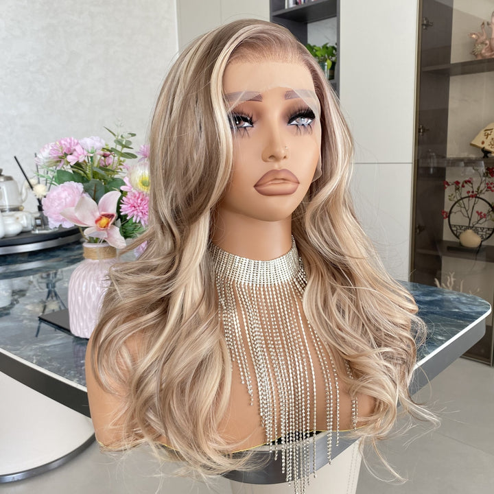 Carkira Mia Blonde with Brown Wig Highlight 13x4 Lace Front Wigs Loose Body Wave Synthetic Fiber Pre Plucked 18Inch for Women